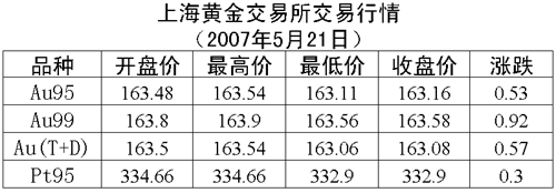 21日,上海黃金交易所黃金Au100g收盤于165.16元/克,上漲0.16元/克,共成交0.60公斤;黃金Au50g收盤于165.00元/克,下跌6.50元/克,共成交0.20公斤;黃金Au99.95收盤于163.16元/克,上漲0.53元/克,共成交2216公斤;黃金Au99.99收盤于163.58元/克,上漲0.92元/克,共成交632.20公斤;鉑金Pt99.95收盤于332.90元/克,上漲0.30元/克,共成交64公斤;黃金Au(T+D)遞延交易品種收盤于163.08元/克,上漲0.57元/克,共成交1516公斤。