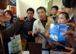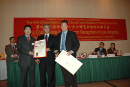 “融資難”是制約中小企業(yè)發(fā)展的首要問題。越來越多關(guān)于中小企業(yè)的展會(huì),都把融資作為主要內(nèi)容。上圖為幾名觀眾在第四屆中國中小投資項(xiàng)目創(chuàng)洽會(huì)軍博開幕了解一個(gè)投資項(xiàng)目的詳細(xì)情況。下圖為在中國國際中小企業(yè)博覽會(huì)(中博會(huì))在洛杉磯舉行的推介會(huì)上,加州議會(huì)議員趙美心的代表特里(中)在向中國國際貿(mào)易促進(jìn)委員會(huì)廣東省分會(huì)副會(huì)長白明韶(左一)頒發(fā)賀狀。(本報(bào)資料照片) |