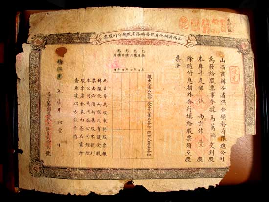 這張“山西商辦全省保晉礦務(wù)有限總公司股票”,就是在這次保晉活動中由山西民眾集資創(chuàng)辦,與英商福公司爭奪礦權(quán)成立的公司的股票,是這段歷史的實物見證,F(xiàn)在我們就來觀察一下這張股票:先看正面,在這張股票的最右面,有“優(yōu)先”二字紅色印章,接著是“山西商辦全省保晉礦務(wù)有限總公司為發(fā)給股票事今據(jù)馬萬福交到股本庫平足銀五兩計作壹股……”的字樣,這家公司將每股股票的金額定的很低,是為了從盡可能大的范圍內(nèi)盡快籌集資金,而“優(yōu)先”的字樣表明這是優(yōu)先股,通過股票背面的文字:“如在第一期將股交足,謂之優(yōu)先股,每股少交銀四錢,作為一年提前支付之股息”的規(guī)定,我們知道,在收取這每股五兩的股金時,為照顧廣大一般民眾,股票的股金定為分三次收取。但如果能夠一次交足,就可以作為優(yōu)先股,每股少交銀四錢,“作為一年提前支付之股息”,有獎勵和優(yōu)惠的性質(zhì)在內(nèi),目的在于爭取盡快多收取興辦公司的資金。 股票正中有一個表,上端有光緒年月日的字樣,另分“讓出人署名簽印、受票人署名簽印、經(jīng)理人署名簽印”三欄,左邊是對這三欄的文字說明:“此表專為股東將股票輾轉(zhuǎn)讓受而設(shè),凡有讓受股票者,必須新舊股東親到本公司或代本公司經(jīng)理股票處于表內(nèi)簽名畫押,查無違礙方能作憑”的字樣。顯然,這是為股票轉(zhuǎn)讓買賣而預(yù)留的地方。但奇怪的是,一般公司股票所設(shè)的這個欄目都印刷在股票的背面,而這張股票卻將這個欄目印在股票的正面中間,加上要求轉(zhuǎn)讓時新舊股東必須同時親到經(jīng)理股票處辦理的文字說明,頗有些不同尋常。實際上,因為這是從外國帝國主義列強手中爭回礦權(quán)的股票,因此對股東的身份有嚴(yán)格的限制!氨x礦務(wù)總公司簡章”的第五條就明確規(guī)定:“本公司唯收華股不收洋股,附股者如私將股票售與外人,經(jīng)本公司查知或經(jīng)他人轉(zhuǎn)告,立將所入之股注銷不認(rèn)”。原來,該股票對股東的轉(zhuǎn)讓和身份十分注重,就是為了保證股東中不能出現(xiàn)外國人。 股票最左邊年代的地方雖有破損和缺字,但依然可看出是“光緒三十年七月初一日”和“保字第捌萬叁千伍佰貳拾貳號”的字樣。這里需要有一點說明,即一般的歷史書在提到保晉礦務(wù)有限總公司時,都指出其成立年份為光緒三十二(1906)年,光緒三十三(1907)年在農(nóng)工商部奏準(zhǔn)正式立案。但這里顯示的這張股票是光緒三十(1904)年七月一號所發(fā),且股票的號碼已經(jīng)排到8萬多號,從股票號碼數(shù)來看該公司不會是剛剛成立,那怎么解釋這個現(xiàn)象呢?可能的解釋是過去的記載不夠準(zhǔn)確,因為山西商辦保晉礦務(wù)總公司成立有籌辦及擴大的過程,前面一個階段因沒有在農(nóng)工商部立案故未留下記錄。 這種解釋可從歷史檔案中得到旁證:據(jù)臺灣編的《礦務(wù)檔》記載,光緒二十九(1903)年二月,山西巡撫奏折中即有反映晉省紳商為抵制福公司開礦,聯(lián)名稟稱愿意籌集股本設(shè)立礦務(wù)總公司,山西巡撫給予批準(zhǔn)并報告清廷的記載。其中要求籌集資本創(chuàng)辦公司的紳商為首之人渠本翹,正是此后在農(nóng)工商部注冊立案的“山西商辦全省保晉礦務(wù)有限總公司”的總理,也是在從福公司贖回礦權(quán)籌集贖金的過程中立下大功的人物。 股票的背面是滿滿的文字,是該公司章程內(nèi)容的擇要刊登。股票雖有缺損,但章程主要內(nèi)容基本上還能夠看得清楚。與當(dāng)時其它股票相比,其中值得注意的地方有三點:一是右面第一行文字開始,是該公司分領(lǐng)“奏準(zhǔn)展限之畝捐”“一律作為五兩一股”“公股”的規(guī)定,這段文字證明,“山西商辦全省保晉礦務(wù)有限總公司”的創(chuàng)辦,得到了當(dāng)時執(zhí)政者的支持,開辦資金中還有得到批準(zhǔn)可以緩交的地畝捐。地畝捐在這里被當(dāng)作“公股”看待。二是下面的文字有“本公司除畝捐外,擬再集資本三百萬兩……”的記載,說明當(dāng)時這家為收回山西礦權(quán)而開辦的公司,計劃的資金規(guī)模很大,除民間籌集外,還有“將官款及地方各項公款撥入公司為股本者,亦以五兩為一股,給票付息”的明確規(guī)定,足以證明當(dāng)時山西各階層民眾為收回礦權(quán),采取了各種方式籌集資金。其三,背面文字中還有“凡有以礦地作股者,按地作價,按價分股,仍以五兩為一股,一律填給股票息折,毫無歧視”的規(guī)定。這條規(guī)定,同樣證明在當(dāng)時籌集資本成立這家公司時,采取了多種多樣靈活的方式,甚至可以將礦地折價作股加入公司,盡可能的起到了動員民眾的作用。 歷經(jīng)百年的歲月風(fēng)云,留存下來的這張老股票已經(jīng)相當(dāng)破舊,但從這張破舊的老股票中,仍然折射出當(dāng)年中國人民不甘屈辱,奮力抗?fàn)幍臍庀,她使我們感動,引發(fā)我們思考,是當(dāng)時歷史風(fēng)云的難得見證。 |