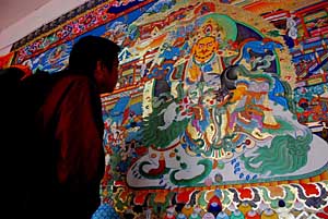 攝 | 2007中國·青海熱貢唐卡藝術(shù)品博覽會日前在藏族畫家之鄉(xiāng)——青海黃南藏族自治州同仁縣落幕,此次博覽會不僅展示了當(dāng)代唐卡藝人的精美畫作,當(dāng)?shù)氐膸姿聫R還首次拿出珍藏數(shù)百年的唐卡藝術(shù)珍品,吸引了眾多收藏愛好者。 據(jù)了解,隨著唐卡被納入首批國家非物質(zhì)遺產(chǎn)名錄以及藏學(xué)熱的日漸升溫,唐卡正受到越來越多收藏家的關(guān)注,而唐卡繪畫這門藏族傳統(tǒng)技藝也隨著唐卡收藏?zé)岬呐d起得到了前所未有的發(fā)展。但在經(jīng)濟利益的驅(qū)動下,目前唐卡市場也出現(xiàn)了以新充舊、顏料作假、粗制濫造等現(xiàn)象。有關(guān)專家認為,只有盡快加以規(guī)范,才能讓唐卡藝術(shù)保持長久的生命力。