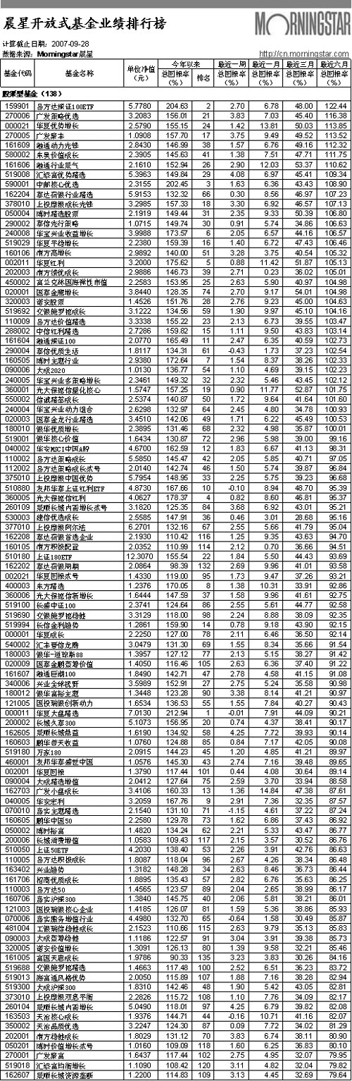 晨星開放式基金業(yè)績排行榜[2007-09-28]