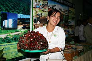 | 一名緬甸農(nóng)業(yè)科技官員捧著棕櫚果實(shí)向參觀者介紹引進(jìn)新品種情況。新華社記者 張?jiān)骑w