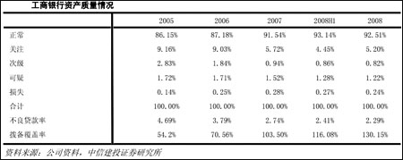 工行2008年不良貸款繼續(xù)雙降,年末不良貸款余額1044.82億元,較2008年初下降了72.92億元,不良貸款率較年初下降0.46%個百分點,撥備覆蓋率(不計稅后利潤中計提的一般準備)達到130.15%,工行的信貸資產(chǎn)配置比較穩(wěn)健,基礎(chǔ)設施、公用事業(yè)等低風險政府背景項目貸款比重較高,預計其資產(chǎn)質(zhì)量在2009年和2010年有望保持穩(wěn)定。