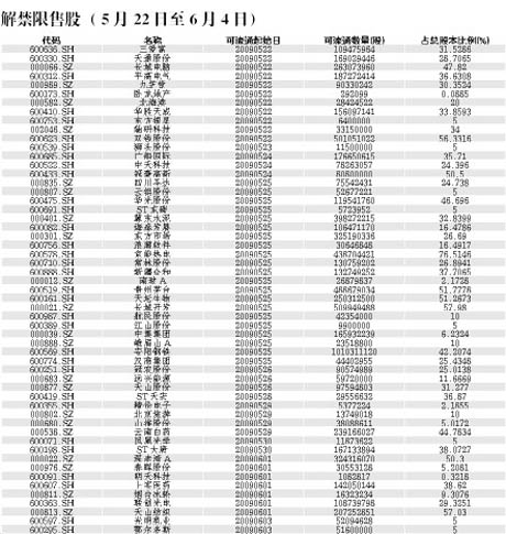 限售股解禁時(shí)間表(2009年6月至2010年2月)