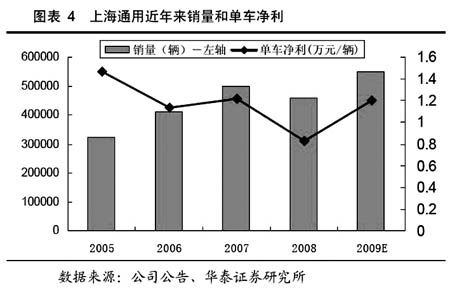 華泰證券研究員陳亮表示,上海汽車是國內最大的整車上市公司,目前上汽集團的整車業(yè)務已基本全部在上市公司中。從近年情況來看,上海通用和上海大眾兩家合資企業(yè)仍然是公司的主要利潤來源。2009年中國汽車市場復蘇、上海通用新車型成功上市,上海通用業(yè)績將實現(xiàn)“V”型反轉。預計上海通用2009年可為上海汽車貢獻凈利潤和EPS分別為33億元和0.5元。而上海大眾近年來銷量和利潤穩(wěn)定增長,同時,受益于車型結構的變化,上海大眾近年來平均單車凈利也穩(wěn)步提高。預計2009年上海大眾平均單車凈利將超過7000元,汽車銷量將超過50萬輛,對上海汽車EPS貢獻在0.3元左右。