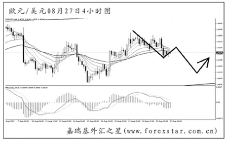 ▲歐元兌美元在高位形成了一個順勢楔形形態(tài),但斜率平緩,不直接構(gòu)成反轉(zhuǎn)效果。短線走勢依舊反復(fù)無常,仍需以區(qū)間操作的思路對待歐元,預(yù)計后市匯價有重新下探1.4100下方的欲望,但跌破日線圖均線系統(tǒng)依托的希望不大。 |