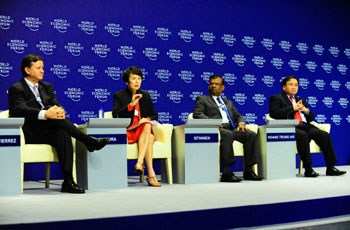 9月11日,2009夏季達(dá)沃斯年會舉行“競爭力新領(lǐng)軍者”專題討論會。在會上,越南副總理黃忠海(右一)、毛里求斯副總理兼財政和經(jīng)濟(jì)發(fā)展部長西塔南(右二)、哥斯達(dá)黎加外貿(mào)部長魯伊斯(左一)暢談如何改善生產(chǎn)力潛能,在全球經(jīng)濟(jì)下滑的情況下,采取哪些戰(zhàn)略來加強(qiáng)長期競爭力。