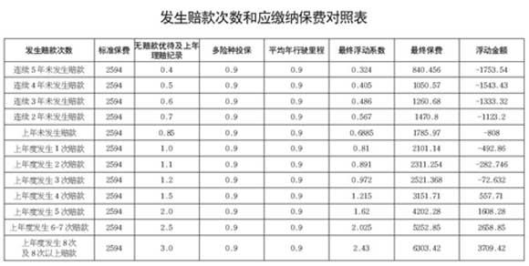 同樣是這輛車,如果其它條件不變,今后4年內(nèi)不出險(xiǎn),到第5年時(shí)保費(fèi)將下浮至840.46元,節(jié)省保費(fèi)1753.54元,中間年度應(yīng)繳納保費(fèi)詳見左表;同樣,如果這輛車上一年度發(fā)生1次賠款,最終費(fèi)率浮動(dòng)系數(shù)為0.81(1.0×0.9×0.9),應(yīng)交納保費(fèi)2101.14元;隨著發(fā)生賠款次數(shù)的增加,保費(fèi)將出現(xiàn)不同程度的上浮,如發(fā)生8次及8次以上賠款,最終費(fèi)率浮動(dòng)系數(shù)將上浮至2.43,應(yīng)交納保費(fèi)6303.42元,比標(biāo)準(zhǔn)保費(fèi)上浮3709.42元。