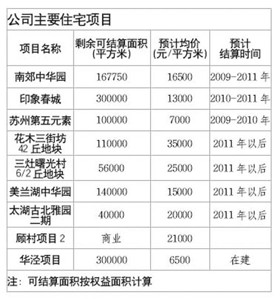 公司今明兩年的盈利主要來自于南郊中華園項(xiàng)目、印象春城項(xiàng)目和蘇州第五元素等住宅項(xiàng)目,以及華寧國際廣場(chǎng)、萬泰大廈、上海國際客運(yùn)中心等商業(yè)項(xiàng)目。2011年之后,花木的高檔裝修公寓、三灶的獨(dú)棟別墅以及美蘭湖中華園等盈利能力較強(qiáng)的項(xiàng)目將進(jìn)入結(jié)算,公司業(yè)績也有較大保障。