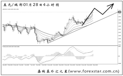 ▲美元兌瑞郎創(chuàng)出了去年12月下旬以來(lái)的新高,短線的上漲斜率加大,匯價(jià)逐步遠(yuǎn)離上升趨勢(shì)線。日線圖上看,均線系統(tǒng)已轉(zhuǎn)為向上排列,從此前第一波反彈的幅度測(cè)算,美瑞至少還有200多點(diǎn)的上漲空間。短線需警惕匯價(jià)向趨勢(shì)線一帶回調(diào)的風(fēng)險(xiǎn)。