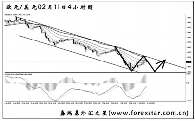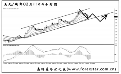 ▲美元兌瑞郎即將考驗(yàn)通道下沿和均線系統(tǒng)的雙重支撐。從日線圖上看,仍有一定的上漲空間,但短線多頭動能減弱,匯價有進(jìn)一步下調(diào)的風(fēng)險(xiǎn)。預(yù)計(jì)跌破通道的希望較大,但下跌幅度將一般。在匯價回抽通道下沿時有一定的做空機(jī)會。