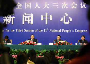 3月9日,中國人民銀行副行長、國家外匯管理局局長易綱(左一)就“外匯管理和外匯儲備”問題在北京梅地亞中心接受中外媒體的集體采訪。易綱重申,要保持人民幣匯率在合理、均衡水平上的基本穩(wěn)定。新華社記者 袁滿 攝 | 聚焦 1 周小川:擇機退出危機時期人民幣匯率政策