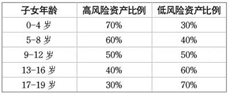 以基金定投方式償債后,王女士家庭每月還有800元凈結(jié)余,建議其從中每月拿出400元進行教育金儲備,方式仍可采用基金定投。由于王女士孩子只有三歲,籌備大學(xué)教育金還有將近16年的時間,故可以選擇部分高風(fēng)險高收益的資產(chǎn)來進行配置,建議其50%選擇激進型,剩余選擇穩(wěn)健型。若按保守的年收益率4%、每月定投400元來進行測算,在孩子19歲時可獲得將近11萬元的教育基金。 很多父母在為孩子選擇教育金的準(zhǔn)備方式上過于激進或過于保守,這都是不可取的。投資風(fēng)格激進的父母將全部資金配置于高風(fēng)險資產(chǎn)中,一旦遇到資本市場行情持續(xù)惡劣和低迷的情況,本金會出現(xiàn)重大虧蝕。而投資風(fēng)格保守的父母又會將全部資金進行銀行儲蓄,分析近20年的歷史來看,不僅國內(nèi)外的教育費用均是逐年遞增的,且通貨膨脹也在侵蝕著我們儲蓄賬戶中的資金。由此,合理選擇教育金的準(zhǔn)備方式尤為重要,建議牢記兩個原則:一是無論您的風(fēng)險承受能力如何,一定要保持至少30%的無風(fēng)險資產(chǎn)的配置;二是越是臨近教育金使用的期限,越是要降低高風(fēng)險資產(chǎn)的比例。 下列資產(chǎn)配置比例可供年輕的父母們做參考: