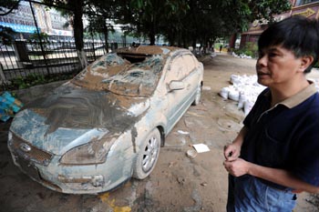 5月11日,在廣州大道金穗大廈院內,市民黃先生看著被水浸破損嚴重的小車欲哭無淚。新華社記者 劉大偉/攝