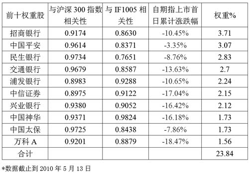 滬深300指數(shù)是滬深300指數(shù)期貨的現(xiàn)貨指數(shù),期指上市近一個(gè)月以來滬深300和IF1005相關(guān)性高達(dá)0.9939。通過格蘭杰因果關(guān)系檢驗(yàn)分析,我們發(fā)現(xiàn)滬深300的變動(dòng)是IF1005變動(dòng)的原因,也即前者對(duì)后者起著引導(dǎo)作用。所以分析滬深300權(quán)重股的走勢(shì)對(duì)預(yù)測(cè)期指的走勢(shì)具有重要參考意義。 在滬深300指數(shù)前十大權(quán)重股中有五只銀行股、兩只保險(xiǎn)股、一只券商股、一只能源股和一只地產(chǎn)股。這十只股票占滬深300指數(shù)的權(quán)重達(dá)到了23.84%。它們與滬深300指數(shù)的相關(guān)性也非常高,都在0.89以上。 從這十只股票的漲跌幅來看,受地產(chǎn)調(diào)控政策影響的萬科跌幅達(dá)18.47%,中信證券自5月4日復(fù)牌后,到13日累計(jì)跌幅也達(dá)17.04%。權(quán)重股的巨大跌幅是拖累現(xiàn)指和期指下行的最重要因素。 從行業(yè)基本面來看,銀行、地產(chǎn)等板塊基本面在國(guó)家宏觀調(diào)控下都偏弱,這也給股指和期指的中期偏弱運(yùn)行定下了主基調(diào)。