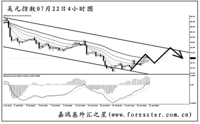美國商務(wù)部上周公布的數(shù)據(jù)顯示,美國5月份國際商品和服務(wù)貿(mào)易逆差擴(kuò)大4.8%,至422.7億美元,創(chuàng)下2008年11月以來的最大規(guī)模。而美國財(cái)政部公布的數(shù)據(jù)顯示,美國6月預(yù)算赤字為684.2億美元,為連續(xù)第21個(gè)月出現(xiàn)預(yù)算赤字,創(chuàng)延續(xù)時(shí)間之最。國內(nèi)消費(fèi)方面,美國6月零售銷售連續(xù)第二個(gè)月下滑,且跌幅超出預(yù)期,表明消費(fèi)支出呈現(xiàn)放緩跡象,并對(duì)受高失業(yè)困擾的經(jīng)濟(jì)形勢(shì)構(gòu)成打擊。美國6月消費(fèi)者物價(jià)指數(shù)連續(xù)第三個(gè)月下滑,創(chuàng)2008年10-12月以來的最長(zhǎng)下滑周期,主要是受到能源價(jià)格下跌的拖累。美國7月中旬消費(fèi)者信心受挫,降至2009年3月以來的最低水平。市場(chǎng)分析師指出,由于美國經(jīng)濟(jì)數(shù)據(jù)全線疲軟,投資者信心遭受打擊,并且也引發(fā)了美國第二季度經(jīng)濟(jì)增長(zhǎng)大幅放緩的憂慮,令美元全線潰敗。 歐洲方面,希臘、葡萄牙、西班牙均成功發(fā)行國債,暗示歐元區(qū)債市有望逐漸恢復(fù)常態(tài),國家主權(quán)債務(wù)違約的風(fēng)險(xiǎn)正在下降。分析人士表示,盡管葡萄牙主權(quán)信用評(píng)級(jí)再遭穆迪調(diào)降,但是對(duì)歐元的沖擊已經(jīng)十分有限。隨著希臘、西班牙和葡萄牙等國國債的信用違約掉期合約價(jià)格開始走低,表明投資者對(duì)這些國家出現(xiàn)債務(wù)違約風(fēng)險(xiǎn)的擔(dān)憂有所緩解。 從圖上看,美元指數(shù)在4小時(shí)圖通道下沿的位置遭遇支撐小幅反彈,圖中均線系統(tǒng)被穿破。原本美元有形成下跌中繼的欲望,但旗形上沿被發(fā)力升破,美元階段性的筑底基本宣告成功,后市將向通道上沿發(fā)起挑戰(zhàn)。短線美元指數(shù)還將有一波下調(diào),下周將以沖高回落的走勢(shì)為主。 下周需重點(diǎn)關(guān)注的財(cái)經(jīng)數(shù)據(jù)及事件包括:7月23日,德國公布7月IFO商業(yè)景氣指數(shù)(前值101.8)、英國公布第二季度GDP初值季率及年率(前值+0.3%、-0.2%);7月26日,日本公布6月商品進(jìn)、出口海關(guān)年率(前值33.4%、32.1%)、美國公布6月新屋銷售總數(shù)年化(前值30萬戶);7月27日,美國公布7月里奇蒙德聯(lián)儲(chǔ)制造業(yè)指數(shù)(前值+23);7月28日,澳大利亞公布第二季度消費(fèi)者物價(jià)指數(shù)季率及年率(前值+0.9%、+2.9%)、美國公布6月耐用品訂單月率(前值-0.6%);7月29日,美聯(lián)儲(chǔ)公布褐皮書、新西蘭聯(lián)儲(chǔ)公布指標(biāo)利率、日本公布6月零售銷售年率(前值+2.8%)、德國公布7月官方季調(diào)后失業(yè)率(前值7.7%)。