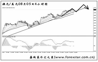 ▲澳元兌美元的漲勢延續(xù),趨勢線和均線系統(tǒng)的依托作用良好。圖中的MACD發(fā)生了數(shù)次的頂背離信號,但在趨勢線被跌破前,需繼續(xù)保持看漲澳元的思路。短線匯價有向趨勢線發(fā)起回調(diào)的欲望,隨即遭遇支撐繼續(xù)創(chuàng)新高的希望很大。預(yù)計下周澳元將是一個沖高回落的運行節(jié)奏。