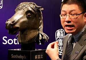 | 馬首銅像將于10月4日至8日在香港蘇富比秋季拍賣預展中展出。 | 香港蘇富比近日宣布,全國政協(xié)常委何鴻燊已以6190萬港元的價格,購入原圓明園海晏堂御制12生肖“水力鐘”噴泉的馬首銅像,并決定將其捐贈給國家。 據(jù)香港蘇富比提供的消息,此件文物原定于今年10月通過香港蘇富比拍賣,但因何鴻燊有意將馬首銅像捐贈國家,原收藏者遂同意拍賣前將銅像售予何鴻燊。 何鴻燊購下文物后表示,很榮幸能參與搶救流失海外文物的工作,繼豬首銅像之后,將馬首銅像捐贈國家。他希望能借此帶動更多的人參與保護中國文物的工作。 據(jù)悉,馬首銅像將于10月4日至8日在香港蘇富比秋季拍賣預展中展出,并從10月9日起在澳門葡京酒店展出。 圓明園海晏堂御制馬首銅像,是清朝乾隆年間修建在圓明園的12生肖報時噴泉(俗稱“水力鐘”)邊的飾物。12生肖動物銅像人身獸首,以盤坐之態(tài)作雙半月形分列噴泉之左右,各自按其代表的12時辰,依次輪流報時,馬首銅像本為噴泉左邊列第三的生肖銅像。 1860年英法聯(lián)軍攻入北京城,報時噴泉慘遭破壞,生肖頭像流失海外。2003年,中國保利藝術博物館用3317萬港元,從香港佳士得和蘇富比兩家拍賣行購得銅牛首、猴首和虎首三件圓明園文物。 目前圓明園獸面人身的12生肖銅像中,豬首、牛首、猴首和虎首四件已回歸祖國,其中的豬首銅像也是由何鴻燊購回并捐贈國家。目前,已知銅鼠首、兔首由法國人收藏;銅龍首、蛇首、雞首、狗首、羊首下落不明。