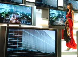 亞洲最大的國際家電展日前在日本千葉縣幕張國際展覽中心開幕,世界807家公司展示了最新研制生產(chǎn)的等離子彩電、數(shù)碼照相機、數(shù)碼攝像機、DVD等數(shù)碼家電產(chǎn)品。圖為模特展示日本東芝、佳能公司共同開發(fā)的高精細、高畫質(zhì)SED彩電。