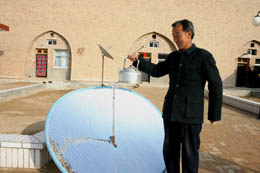 近年來(lái),在國(guó)家農(nóng)業(yè)部、發(fā)改委的大力支持下,甘肅省先后實(shí)施了“生態(tài)家園富民計(jì)劃”、“農(nóng)村小型公益設(shè)施補(bǔ)助資金農(nóng)村能源”和“農(nóng)村沼氣利用國(guó)債”等一系列新能源利用和生態(tài)保護(hù)綜合項(xiàng)目。截至目前,甘肅省農(nóng)民使用太陽(yáng)灶達(dá)超過(guò)50萬(wàn)臺(tái),居全國(guó)第一位;建成農(nóng)村戶用沼氣池12.3萬(wàn)個(gè),相當(dāng)于每年可減少砍伐林地30萬(wàn)畝,節(jié)約煤炭10萬(wàn)余噸。圖為甘肅省慶陽(yáng)市華池縣悅樂(lè)鎮(zhèn)新堡子村農(nóng)民龐平剛正在用太陽(yáng)能熱水器燒開(kāi)水。 |