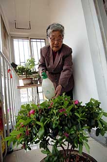 家住天津市河?xùn)|區(qū)彩麗園廉租房的竇紅珍老人在澆花。本報記者 王曄彪