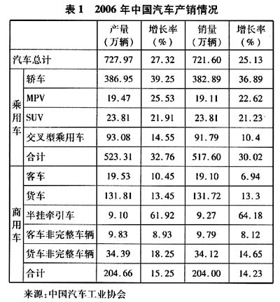 2006年是進入WTO后過渡期中國汽車產(chǎn)業(yè)的關鍵年,國內(nèi)需求增長強勁推動汽車市場規(guī)模快速擴張。盡管2006年出現(xiàn)了燃料油價格上漲、新的汽車消費稅收政策和城市交通堵塞更趨嚴重等諸多不利因素,但在中國人均可支配收入持續(xù)較快增長、城鎮(zhèn)居民私人轎車需求增勢強勁、大型基建和城際城市物流的貨車需求回升以及新農(nóng)村建設助推汽車消費等有利因素的作用下,中國汽車尤其是乘用車(轎車)市場消費規(guī)模擴張再次提速。