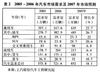 2007年我國宏觀經(jīng)濟形勢持續(xù)向好,二三級市場的開始啟動,并成為拉動乘用車市場持續(xù)、快速發(fā)展的主要動力。2007年眾多新車型的上市將使國內(nèi)轎車市場的“蛋糕”進一步做大,更會吸引一部分潛在用戶將購買欲望轉(zhuǎn)換為購買需求。再綜合考慮金融市場影響因素及中國乘用車市場強烈的內(nèi)在需求,2007年的轎車市場將繼續(xù)保持快速發(fā)展。