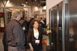 日前在美國拉斯韋加斯開幕的國際廚衛(wèi)設(shè)備展上,海爾推出的全球首臺超級空間法式對開門冰箱成為展會的一大亮點。這種冰箱在世界屬于首創(chuàng),以容積大、技術(shù)先進、價格高等因素成為高端冰箱市場的代言產(chǎn)品。圖為展會上海爾集團總裁楊綿綿在向客戶和觀眾介紹海爾新近推出的超級空間法式對開門冰箱。