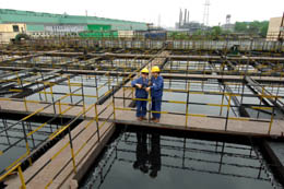 近年來,江西新余鋼鐵有限責(zé)任公司通過科技進(jìn)步節(jié)能減排走循環(huán)經(jīng)濟(jì)的道路,加大了“三廢”綜合利用,2006年,企業(yè)利用廢氣余熱發(fā)電達(dá)3.74億千瓦時,廢水排放量年減少1634.4萬噸,廢渣年處理能力數(shù)120萬噸,通過變廢為寶,年增收3億多元。圖為兩名員工正在對工業(yè)凈化水進(jìn)行取樣檢測。