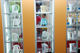 2007中國日用小家電博覽會日前在浙江余姚舉行,吸引來自長三角、珠三角、環(huán)渤海灣三大小家電產(chǎn)業(yè)集聚區(qū)的300多家企業(yè)參展,參展產(chǎn)品近萬種。圖為一公司展區(qū)擺滿了各種款式的電熱水壺。