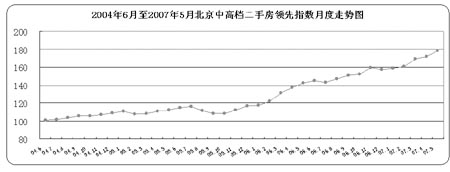 2007年5月,北京中高檔住宅成交領(lǐng)先指數(shù)為178點(diǎn),均價(jià)為11583.2元/平方米,環(huán)比4月份成交價(jià)格上漲3.76%,仍然呈現(xiàn)穩(wěn)步上漲狀態(tài)。但從成交量上來看,5月份同4月份相比較,二手房成交量雖然仍在上漲,但交易活躍度不高,漲幅在5%左右。