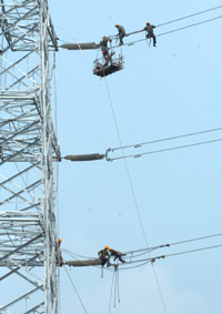 天津電力建設(shè)史上規(guī)模最大、線(xiàn)路最長(zhǎng)的電網(wǎng)工程——東麗500千伏輸變電工程,已進(jìn)入后期施工階段。圖為施工人員在酷暑下進(jìn)行放線(xiàn)施工。