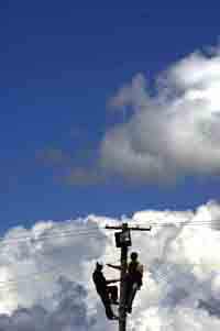 兩名工作人員在維修電線。本報記者:普布扎西