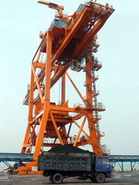 2006年6月建成投產(chǎn)的廣西欽州市欽州港區(qū)7萬噸煤炭專業(yè)碼頭,現(xiàn)正式對外營業(yè)。項目建成7萬噸泊位和2000噸級泊位各一個,總投資6億元,年吞吐能力400萬噸。圖為天盛7萬噸煤炭專業(yè)碼頭的主吊塔。