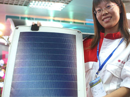 在第三屆中國吉林·東北亞投資貿(mào)易博覽會上,參會的中小企業(yè)展出的一些環(huán)保節(jié)能產(chǎn)品,受到與會客商和參觀者的關注和青睞。圖為一名工作人員在展示便攜式太陽能電池板。