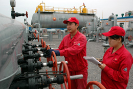 中國石油長慶油田公司石油勘探工作又獲重大突破,位于鄂爾多斯盆地西南部的西峰油田,截至2006年底三級儲量已達(dá)到5.68億噸。圖為中國石油長慶油田公司第二采油廠兩名職工在西一聯(lián)合站來油總機(jī)關(guān)切換來油進(jìn)站流程。