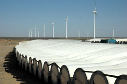 甘肅河西走廊擁有豐富的風(fēng)能資源,風(fēng)能資源理論儲(chǔ)量為2.37億千瓦,可開(kāi)發(fā)利用的總量達(dá)2667萬(wàn)千瓦,甘肅在河西走廊規(guī)劃了18個(gè)大中型風(fēng)電場(chǎng),總裝機(jī)規(guī)模2000萬(wàn)千瓦,使這里逐漸成為我國(guó)清潔能源基地。圖為瓜州縣風(fēng)電場(chǎng)。 |