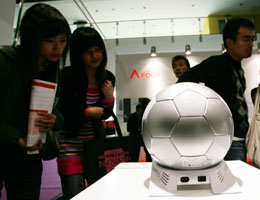 在日前舉行的中國無錫國際工業(yè)設計博覽會上,眾多創(chuàng)意十足的產(chǎn)品吸引了廠商和普通消費者的眼球。圖為一款足球造型的車載冰箱。
