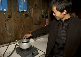 貴州省黔東南苗族侗族自治州鎮(zhèn)遠(yuǎn)縣積極發(fā)展農(nóng)村沼氣,截至11月底,全縣累計(jì)建池1.5894萬口,建成后的每口沼氣池每年能夠節(jié)約薪柴約3噸,保護(hù)3至4畝森林。圖為村民在用沼氣燒水。