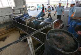 浙江某公司利用餐飲廢油生產(chǎn)柴油工藝,將一桶桶黑糊糊的“地溝油”經(jīng)沉淀、過濾、提純等系列工序后,變成了清潔環(huán)保的生物柴油。 | “高油價”背景下,就在河北不少地區(qū)加緊開工建設(shè)生物柴油項目時,3家已建成投產(chǎn)的生物柴油加工企業(yè)日前卻向記者反映,所需要的黃連木籽、泔水油、地溝油等原材料供應(yīng)不足,導(dǎo)致無法達(dá)到預(yù)期產(chǎn)能。他們認(rèn)為,這些表面看上去十分豐富的廢棄物,由于回收組織化程度低,并不能源源不斷地輸送給煉油企業(yè);此外,一些專家表示,由于目前廢棄油脂處理處于無序狀態(tài),廢棄油脂流向令人擔(dān)憂,這一系列問題亟待引起政府重視。