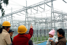 重慶市500千伏巴南變電站日前竣工并投入運(yùn)營(yíng)。重慶市提前3年建成了500千伏“日”字形環(huán)狀電網(wǎng),形成了環(huán)狀“供電高速公路”,鞏固了國(guó)家電網(wǎng)西電東送的中部通道。 電力供應(yīng)緊張近年來一直是重慶的老大難問題,尤其是在夏季,許多地區(qū)不得不拉閘限電,給老百姓生活和許多工業(yè)企業(yè)的生產(chǎn)造成很大影響。究其原因,主要是重慶電網(wǎng)建設(shè)落后于電源建設(shè),造成了“有電輸不出去”的局面。重慶環(huán)狀“供電高速公路”的建成,基本打破了原有的供電瓶頸。圖為工人和市民正在參觀投入運(yùn)營(yíng)的巴南變電站。 |