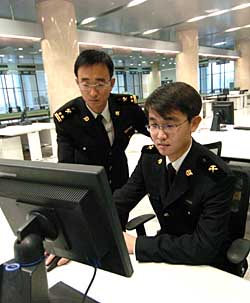 | 天津東疆保稅港區(qū)海關(guān)工作人員在調(diào)試電腦。新華社記者 劉海峰