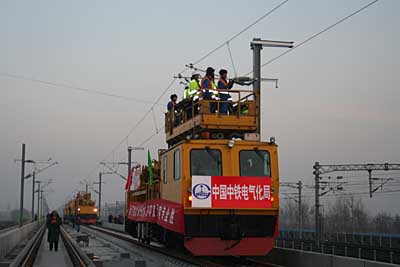 12月12日,我國首條時(shí)速達(dá)350公里的高速鐵路客運(yùn)專線——京津城際鐵路第一條接觸網(wǎng)導(dǎo)線成功架設(shè),標(biāo)志著京津城際鐵路電氣化工程架線施工全面展開。京津城際鐵路電氣化工程引進(jìn)德國高速鐵路技術(shù),全長115公里,將于北京奧運(yùn)會(huì)前投入使用。屆時(shí)京津通達(dá)只需半小時(shí),且5分鐘發(fā)一次車。圖為承擔(dān)施工任務(wù)的中鐵電氣化局一公司的職工在架設(shè)接觸網(wǎng)導(dǎo)線! | |