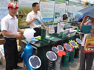 | 在濟(jì)南泉城廣場(chǎng)。太陽能光伏產(chǎn)品吸引了人們的目光。近年來,太陽能、風(fēng)能方興未艾,將為改善我國能源結(jié)構(gòu)發(fā)揮更加重要的作用。本報(bào)記者