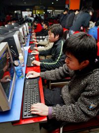 來自中國電信上海公司的最新數據顯示,上海的寬帶用戶已達300萬戶,平均每六人就擁有一根寬帶,成為全國寬帶用戶數量最多的城市。圖為幾名上海大學生在網吧內用裝有寬帶的電腦上網。