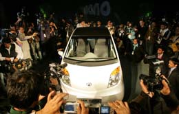 印度塔塔汽車公司近日在新德里舉行的一個汽車展上推出一款名為名為Tata Nano的小車,售價預(yù)計為2500美元。業(yè)內(nèi)人士對這款價格超低的新車褒貶不一。塔塔汽車公司董事長拉坦·塔塔說,在印度,許多四口之家共乘一輛摩托車出行,父親駕駛,母親坐后座,中間夾坐著兩個孩子。他希望這款價格低廉的新車能讓工薪族家庭的出行更為安全,并促使其他汽車企業(yè)降低車價。新華社/法新