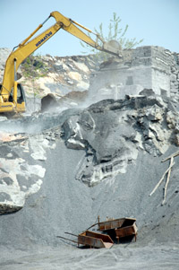 挖掘機正對礦山違法開采加工點進行拆除。 | 礦產(chǎn)資源是我國經(jīng)濟和社會發(fā)展的物質(zhì)基礎(chǔ)。我國90%的能源、95%以上的工業(yè)和農(nóng)業(yè)原材料都來自于礦產(chǎn)資源。然而,由于隨著人口的快速增長,國家工業(yè)化程度的快速發(fā)展,資源供需矛盾日益突出,我國礦產(chǎn)資源面臨的形勢日益嚴峻,對外依存度將長期居高,礦產(chǎn)資源能否可持續(xù)供應(yīng)將是全社會關(guān)注的重大問題。 中國工程院院士、礦床地質(zhì)學(xué)家陳毓川日前在云南參加紅河論壇時表示,我國應(yīng)繼續(xù)實施找礦戰(zhàn)略,開拓新礦產(chǎn)資源領(lǐng)域,實施戰(zhàn)略礦產(chǎn)資源儲備等,以保證我國礦產(chǎn)資源的可持續(xù)供應(yīng),解決我國經(jīng)濟發(fā)展過程中出現(xiàn)的資源制約問題。