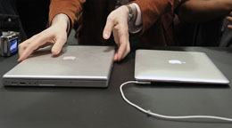 日前,蘋果電腦公司在美國(guó)加州舊金山舉行的“蘋果大會(huì)”上,推出厚度僅為1.94厘米,重量1.36公斤的MacBook Air筆記本電腦。圖為參觀者正在比較MacBook Air和以前出品的MacBook Pro筆記本電腦。
