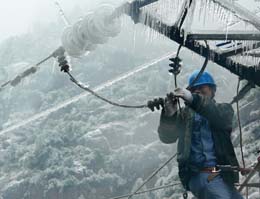 浙江縉云縣一位電力職工在海拔800多米的高山上接線(2月2日攝)。 2月16日,浙江省因冰雪災(zāi)害停電的341個鄉(xiāng)鎮(zhèn)全部恢復(fù)通電。浙江省在冰雪災(zāi)害中共有341個鄉(xiāng)鎮(zhèn)、8749個村停電。從2月2日起浙江電網(wǎng)啟動最高級別的應(yīng)對冰雪災(zāi)害一級應(yīng)急響應(yīng),全省3萬多名員工奮戰(zhàn)在抗災(zāi)搶險第一線。 |