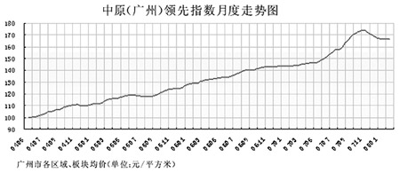 2008年2月,中原(廣州)領(lǐng)先指數(shù)為166.4,環(huán)比下降0.2,降幅僅為0.1%。自去年12月中原領(lǐng)先指數(shù)出現(xiàn)大幅度的下滑,其后三個月價格連續(xù)下跌,但跌幅逐月收窄,到本月止,降幅已經(jīng)由2.7%減少到了0.1%,價格走勢已明顯止住了跌勢,有回歸穩(wěn)定的跡象。